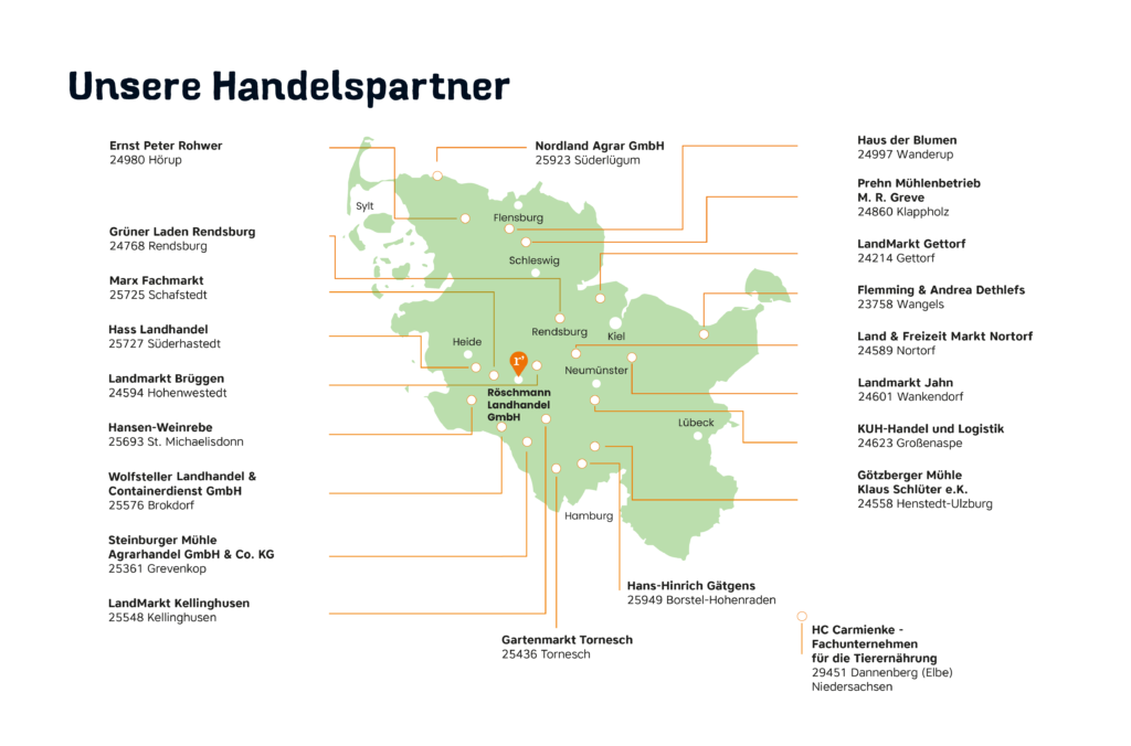 In den letzten Jahrzehnten haben wir uns ein kleines und feines Händlernetzwerk aufgebaut. So können Sie unsere eigenen Futtermittel auch in Ihrer Nähe kaufen – denn Sie finden unsere Handelspartner verteilt in ganz Schleswig-Holstein. Da die Handelspartner wöchentlich bestellen und beliefert werden, können wir Ihnen unsere Produkte auch zum Händler in Ihrer Nähe liefern.